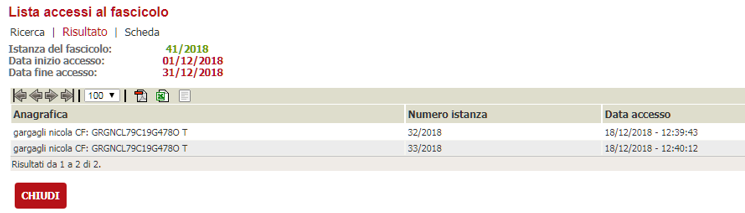 All'interno del dettaglio di un fascicolo sarà presente il bottone "Visualizza Accessi" che permetterà di visualizzare gli accessi fatti per ogni singola istanza dal frontoffice