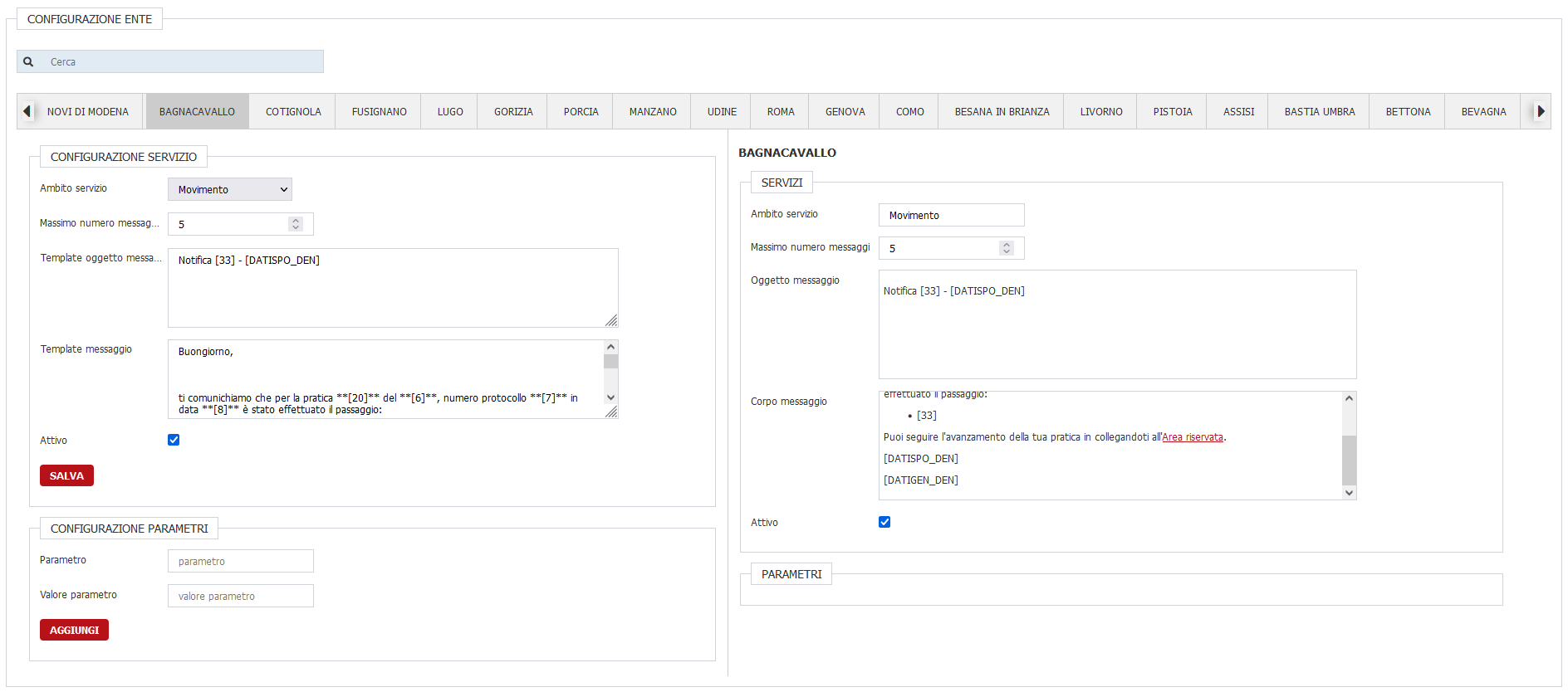 Ora andiamo a settare i parametri per ogni comune.