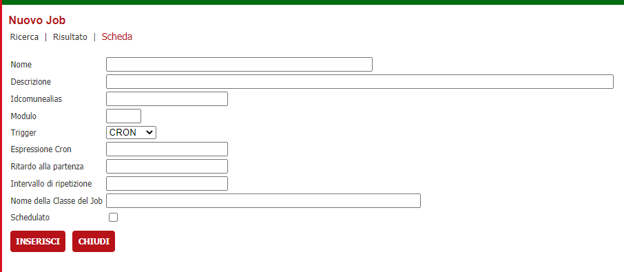 - Schedulato: Se spuntato, il JOB verrà eseguito in maniera schedulata e sarà possibile testarlo.