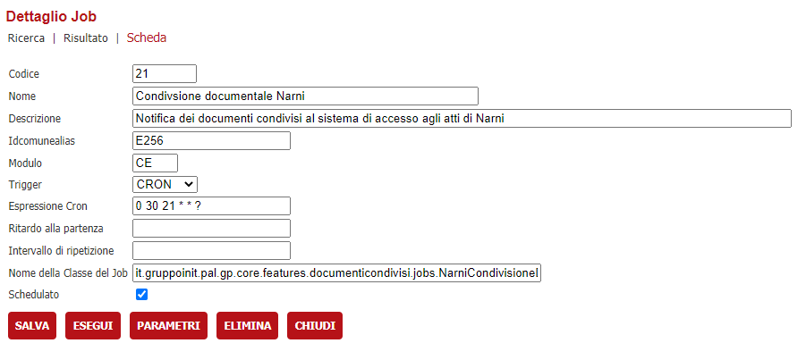 E' necessario spuntare la schedulazione e riavviare il tomcat anche solo per poterlo testare tramite il pulsante ESEGUI in quanto altrimenti il job non viene preventivamente caricato in memoria