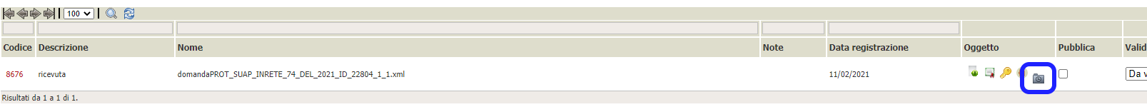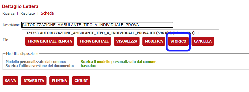 Se il file che si sta modificando ha una storia, viene reso evidente dalla comparsa del bottone STORICO