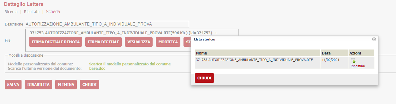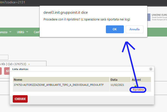 All'interno della lista sarà possibile eseguire il ripristino del file tramite il link ripristina, ma solamente dell'ultimo passaggio; per cui eventuali ripristini a versioni più vecchie dovranno essere effettuate in sequenza.