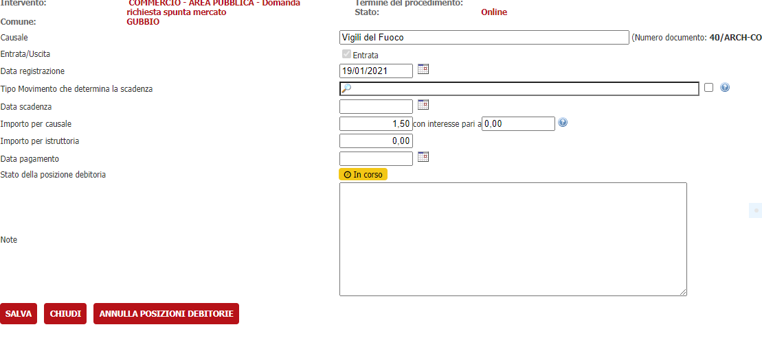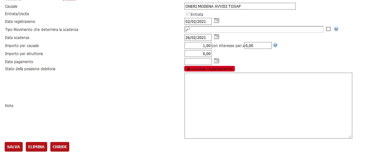 Cliccando il bottone "Annulla", apparirà un messaggio che chiede conferma della possibilità di eliminare la posizione debitoria. Accettando verrà annullata la posizione e comparirà il messaggio "Conclusa negativamente".