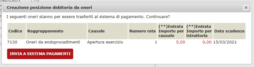 Cliccando sul bottone si aprirà un pop up con la lista degli oneri che saranno inviati al sistema dei pagamenti.