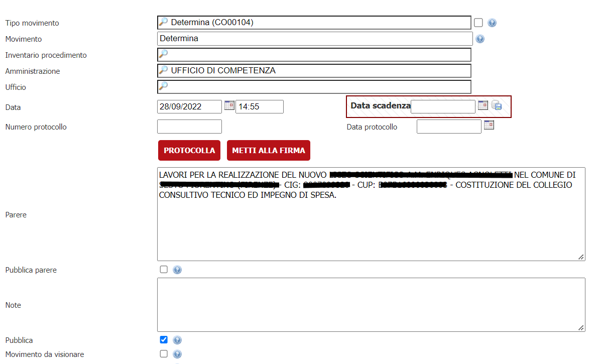 Va attivata la protocollazione configurando lo specifico connettore ( non oggetto di questa guida ). Qualora non sia necessario fascicolare gli atti, questa funzionalità può non essere configurata
