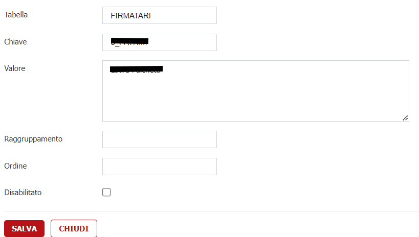 - Censire il nuovo firmatario inserendo come Chiave il codice che identifica il firmatario nel gestionale atti esterno e Valore la descrizione del firmatario che comparirà in fase di rilascio atto