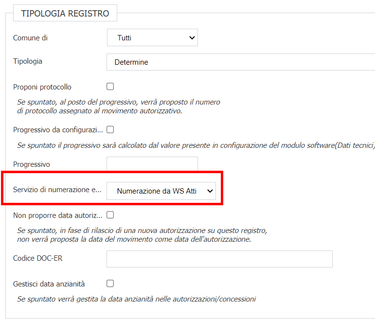 Va impostata come numerazione nel campo "Servizio di numerazione esterna" il valore "Numerazione da WS Atti"