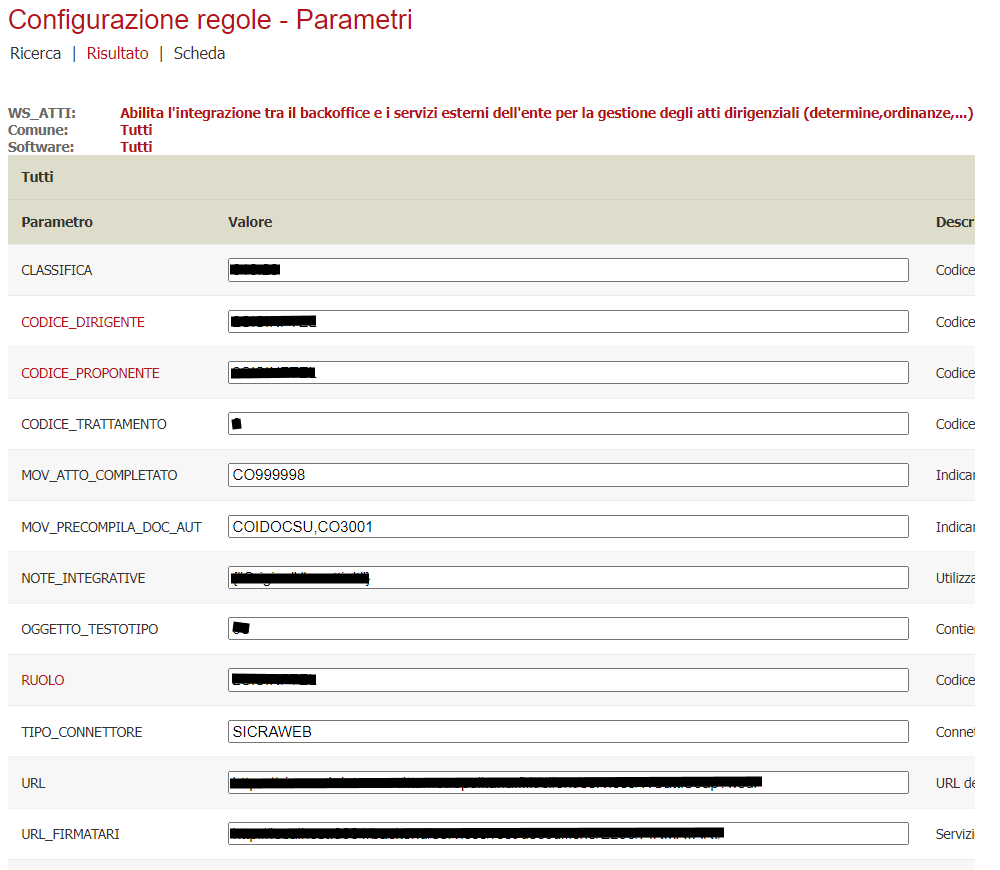 | TIPO_CONNETTORE | Connettore da utilizzare per il collegamento al servizio di gestione atti. ( Attualmente è implementato solo SICRAWEB |
