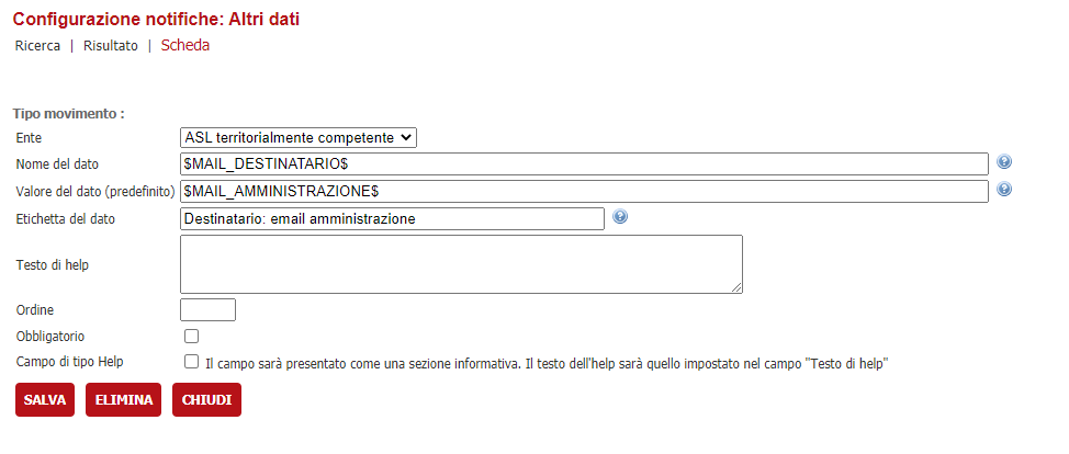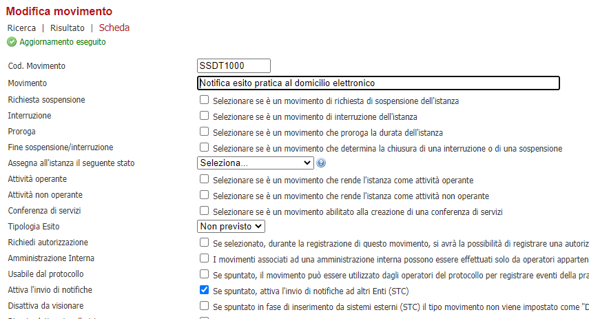 Una volta censita l'amministrazione, bisogna andare nel movimento che attiva questa notifica ed assicurarsi che abbia il flag "Attiva l'invio di notifiche" spuntato