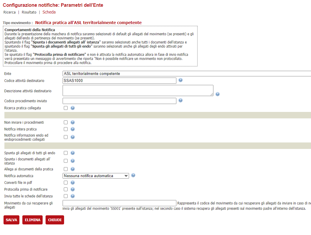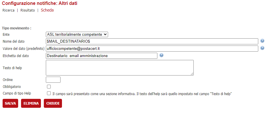 Selezionare come Ente, l'amministrazione precedentemente creata e indicare come Codice attività destinatario il codice del tipo movimento che stiamo configurando, i restanti dati sono liberamente configurabili a seconda di cosa si intende notificare; salvare per confermare quanto fatto