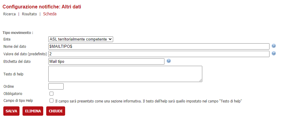 Selezionare come Ente lo stesso indicato precedentemente, come Nome del dato inserire il segnaposto \$MAILTIPO\$ per indicare a VBG che l'oggetto e il corpo della mail saranno valorizzati tramite una mail tipo; nel campo Valore del dato (predefinito) indichiamo il codice della mail tipo che verrà utilizzato. I campi "Etichetta del dato" e "Testo di help" non sono influenti e possono essere impostati liberamente, si raccomanda di mettere un testo che indichi cosa abbiamo configurato.