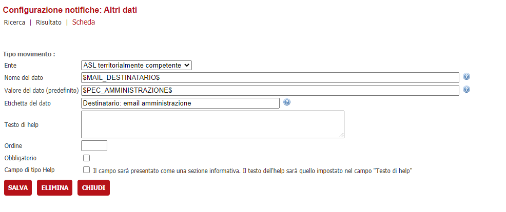 Selezionare come Ente, l'amministrazione precedentemente creata. Valorizzare il campo Nome del dato con il seguente segnaposto \$MAIL_DESTINATARIO\$ e il campo Valore del dato (predefinito) con il seguente segnaposto \$PEC_AMMINISTRAZIONE\$. Anche in questo caso, i campi "Etichetta del dato" e "Testo di help" non sono influenti e possono essere impostati liberamente