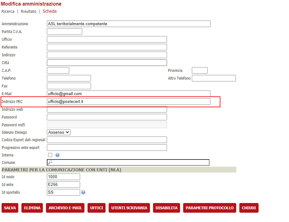 La configurazione è analoga a quanto sopra con in più il fatto che tale amministrazione deve aver valorizzato il campo Indirizzo PEC