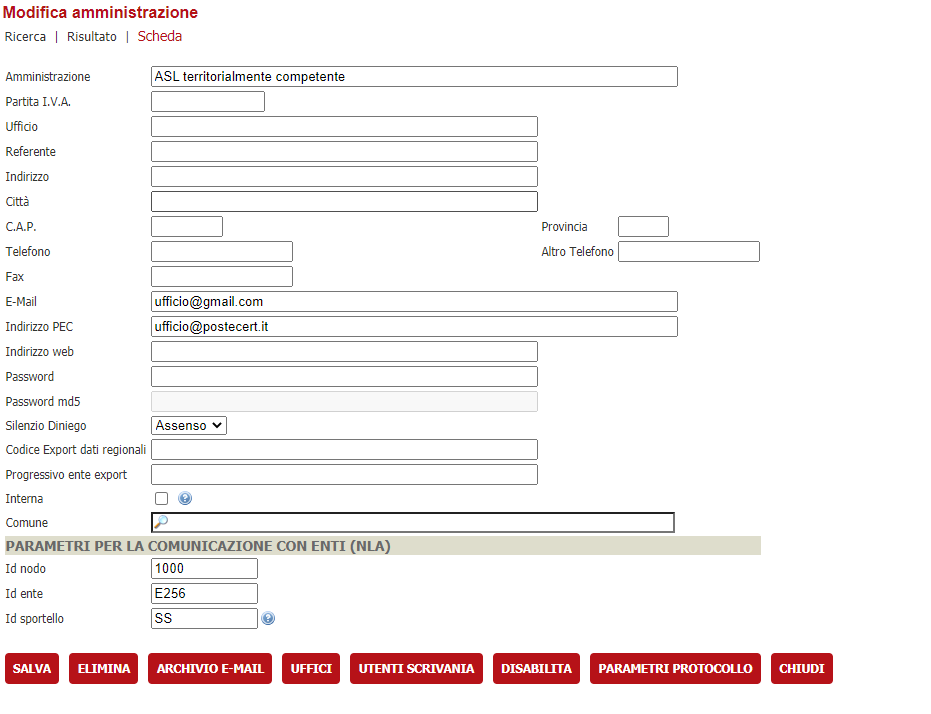 Per fare ciò bisogna prima censire una finta amministrazione che atta ad identificare il nodo STC che invia le mail in VBG; i passaggi da eseguire sono: - creare una nuova amministrazione chiamandola, ad esempio, Mail Service ( il nome è libero ma è consigliato riportare qualcosa che faccia capire subito a cosa si riferisce ) - impostare i valori Id nodo, Id ente, Id sportello secondo alcuni criteri: