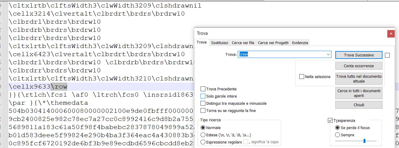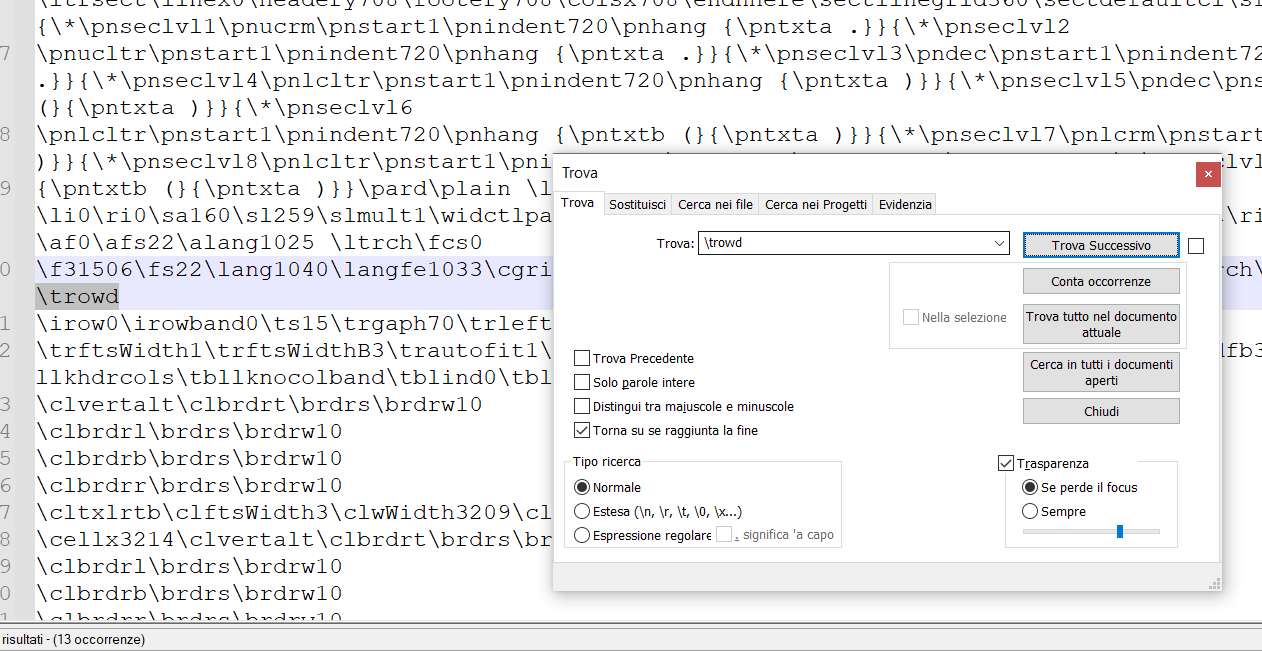 Individuare la prima occorrenza della parola \trowd e cancellare tutto quello che è presente prima