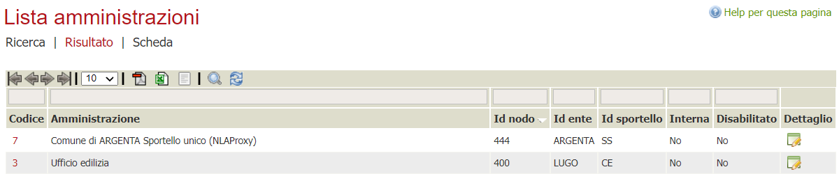 Configurate le amministrazioni che rappresentano l'ufficio sportello unico e il nodo nla-proxy (ovvero per conto dell'ufficio sismica della provincia di Ravenna).