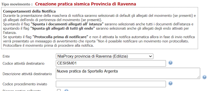 La creazione delle pratiche nell'ambiente di Ravenna si basa sul fatto che l'endoprocedimento inviato sarà quello principale configurato nella voce dell'albero es: Albero Ravenna