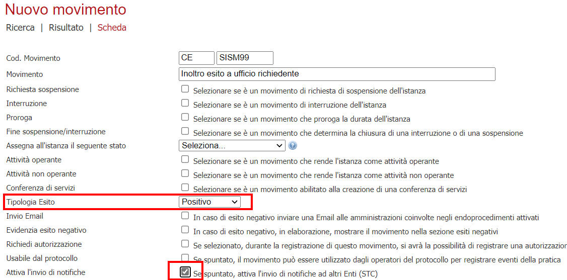 Il movimento è configurato per indicare un esito e per essere notificato da STC