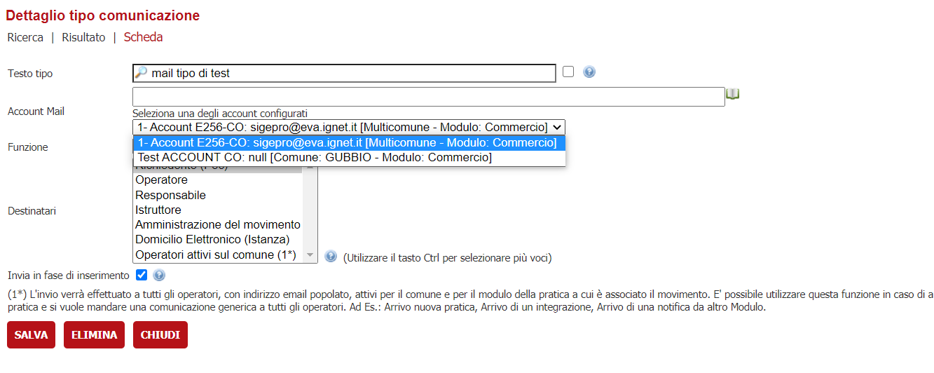 Per modificare una comunicazione si clicca sul link della colonna codice o della colonna dettaglio come visto in fig 4 . Si ottiene una schermata del genere. Si può scegliere un account diversa e poi salvare la modifica.