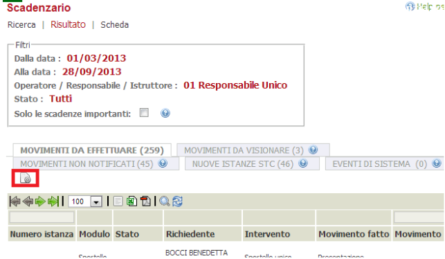 La lista ottenuta si potrà esportare nei formati csv, xml o PDF selezionando le relative icone nella barra in alto alla tabella.