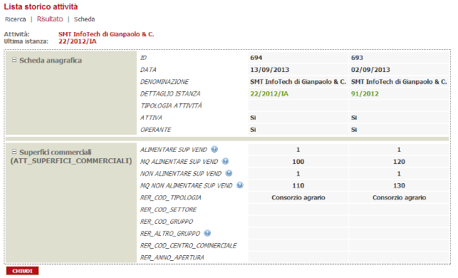 La lista mostra che dopo l'istanza 1 è presente un'attività (Es. un negozio) in una determinata localizzazione. Dopo l'istanza 24 il negozio è sempre 1 anche se è un'altra localizzazione, ha un altro proprietario ed ha cambiato la superficie di vendita. Dopo l'istanza 30 il negozio non è più presente nel territorio comunale.